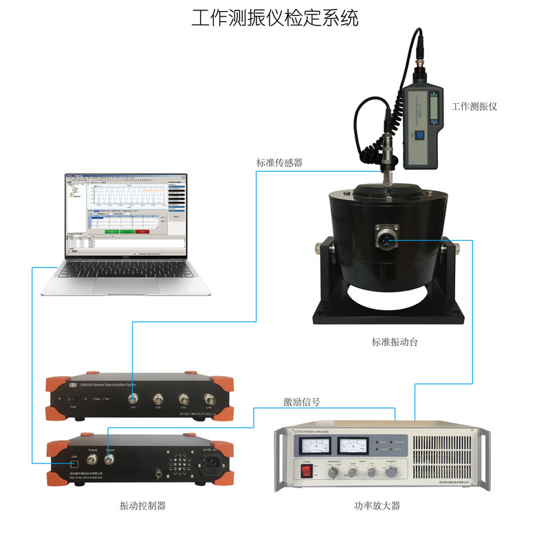 整個系統由USB4204 振動控制器、激振器、功率放大器、計算機、高精度標準加速度計和被測傳感器組成。信號分析儀通過USB2.0接口與計算機進行通信,測試方便快捷,測試完成自動生報測試報告。